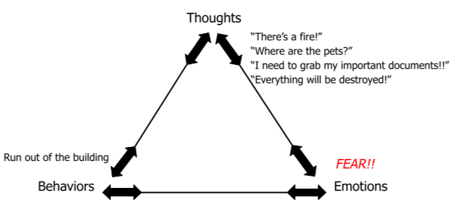For example, if I hear a fire alarm and think, “There’s a fire!” I’ll likely feel afraid—and that fear will drive me to run out of the building.